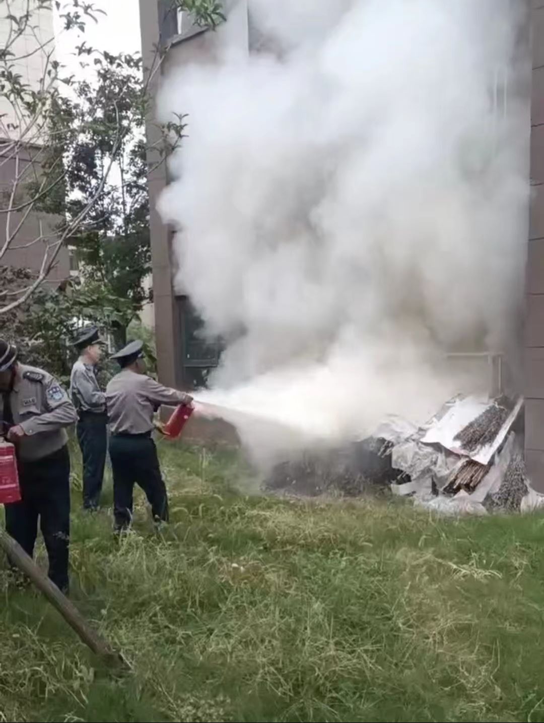 在扑救期间,不少居民上前围观,我保安人员一边紧急灭火,一边疏散群众,同时对附近可燃物进行清理;为防止复燃,用水枪对杂物堆进行喷洒,直至烟雾完全消失。当消防人员赶到时,保安员已经将火扑灭。