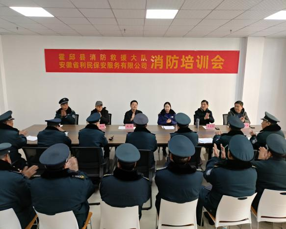 霍邱县蓼城资产管理公司负责人胡淼、育英嘉苑物业办负责人屠新民,安徽省利民保安服务有限公司总经理李光明、常务副总徐丛红、分管副总经理杨镐,重点客户单位消防员、保安员参加培训会。